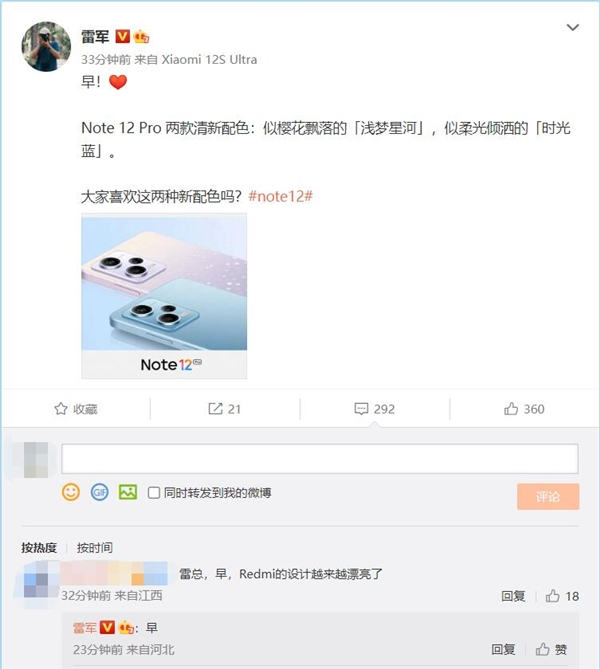今日上午,小米创办人雷军晒出了Redmi Note 12系列两款清新配色:似樱花飘落的浅梦星河和似柔光倾洒的时光蓝。