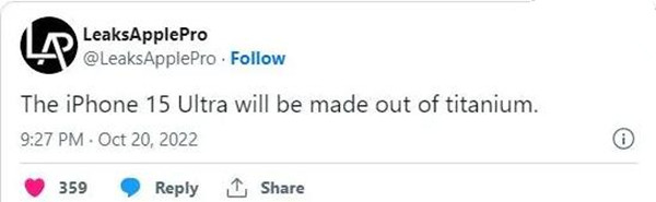 LeaksApplePro 表示,苹果将为 iPhone 15 Ultra 提供粉丝们梦寐以求的钛合金外壳。此前苹果已在 iPhone 手机中采用不锈钢。