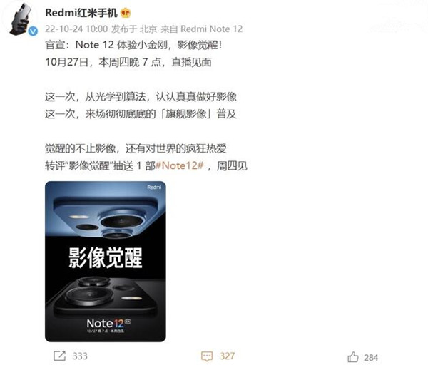 10 月 24 日消息,今日上午,Redmi 红米手机官方宣布,Redmi Note 12 系列将于 10 月 27 日(周四)19:00 发布,宣传语为“影像觉醒”。