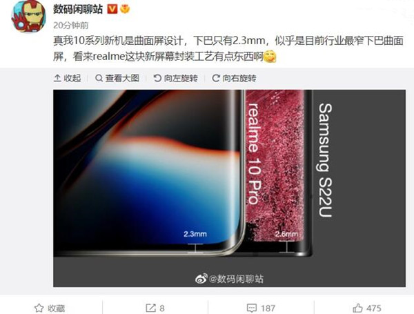 10 月 24 日消息,近期,realme 真我手机将在国内发布全新的数字系列 ——realme 10。现在爆料显示,realme 10 / Pro 系列新机采用曲面屏设计,确切来说是,realme 10 Pro 采用双曲 OLED 屏幕柔性 COP 封装,下巴 2.3mm ,显示比三星 Galaxy S22 Ultra (下巴 2.6mm)还窄。
