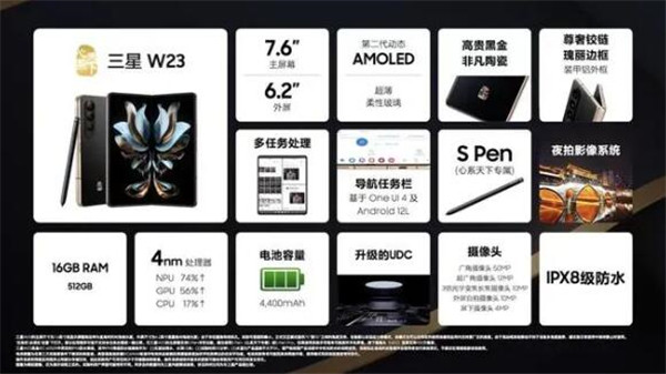 三星 W23 内屏尺寸为 7.6 英寸,分辨率为 2176×1812,外屏尺寸为 6.2 英寸,分辨率为 2316×904,后置 5000 万主摄,支持 OIS 光学防抖,同时配备 1000 万像素长焦和 1200 万超广角,内屏前置摄像头为 400 万像素,电池为 4400mAh。