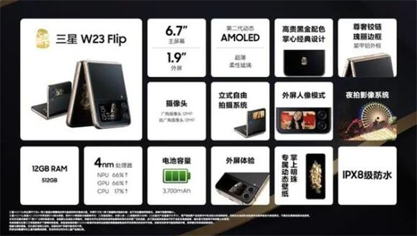 W23 Flip 与三星 Galaxy Z Flip4 均搭载了高通骁龙 8+ Gen 1 处理器,拥有 12GB 内存,采用 6.7 英寸 2640 x 1080 分辨率 120Hz 刷新率主屏以及 1.9 英寸 260 x 512 分辨率小屏。