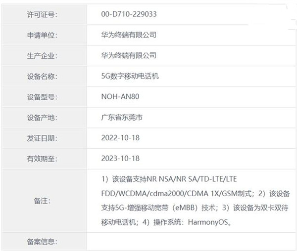 10 月 21 日消息,工信部网站显示,一款型号为 NOH-AN80 的华为 5G 数字移动电话机于 10 月 18 日通过工信部电信设备进网许可,申请单位和生产企业均为华为终端有限公司。