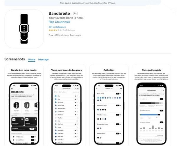 Bandbreite 提供了有史以来每个苹果官方 Apple Watch 表带的全面信息,包括颜色、发布日期、型号和价格等细节。该应用还允许跟踪用户已经拥有的表带,并提供关于收藏的统计和见解,比如最喜欢的颜色。