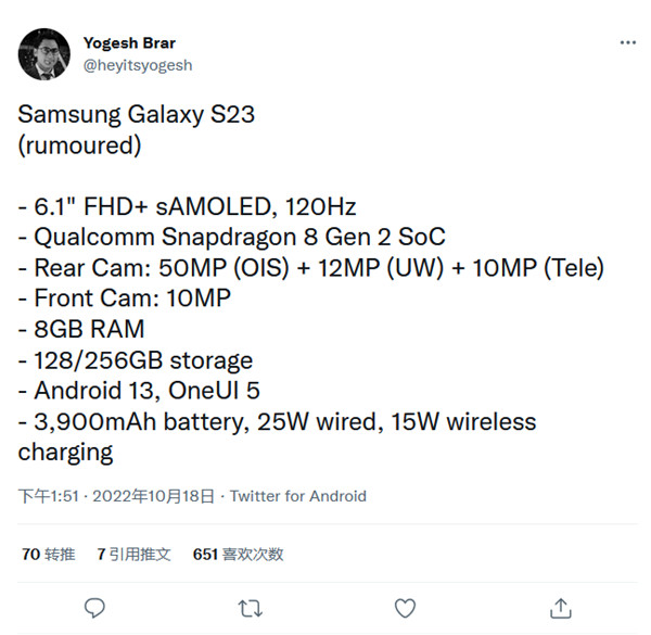 Galaxy S23 的摄像头规格依然和 S22 相同,但是三星希望通过软件和算法上的升级来改善拍摄性能。该手机将再次包括 128GB 或 256GB 的内部存储空间以及 8GB 的 RAM。三星最近宣布了更快的 LPDDR5X,因此有可能装备在即将推出的 S23 型号上。