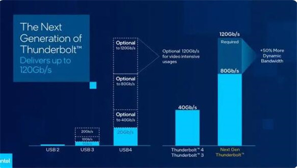 两倍于 Thunderbolt 4 的总带宽,达到 80Gbps,同时为视频密集型使用提供多达三倍的带宽,达到 120Gbps。