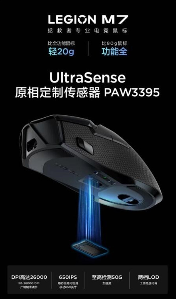 10月20日,联想官方公布了拯救者M7鼠标的相关硬件配置——采用与原相合作定制的PAW3395传感器,具有高达26000 DPI,能在LEGION EDGE定制驱动中调节。该鼠标预计将在本月底发布,双11期间开售,目前还未公布售价。