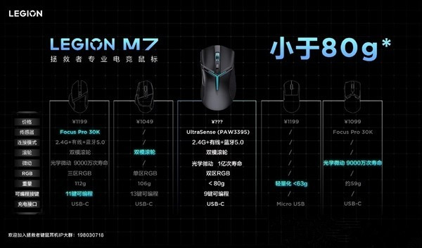 据官方表示,拯救者M7电竞鼠标“比全功能鼠标轻20g,比80g鼠标功能全”,可实现650 IPS,可检测达50G加速度,可调节两挡LOD。此外,该鼠标还支持2.4G、有线和蓝牙5.0三模连接,支持多设备快速切换;还配备有双模滚轮,光学微动寿命达1亿次,配备一个USB-C接口。