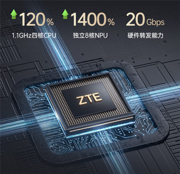 据了解,路由器搭载中兴自研12核主芯片,具备8核NPU (独立网络加速引擎),可实现数据包快速转发性能提升1400%、4核1.1GHz CPU,性能提升120%,双向数据吞吐能力达到20Gbps。