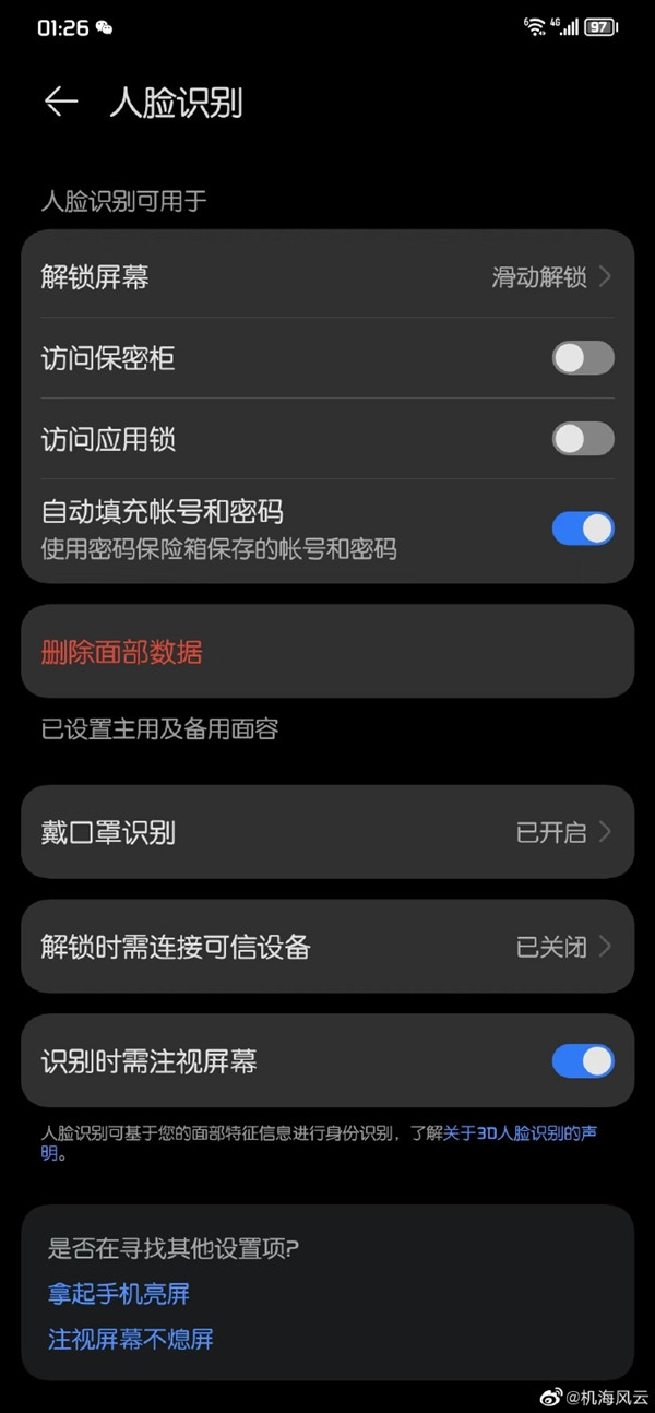 从升级后一些用户的反馈看,当Mate 50 Pro开启“戴口罩识别”功能后,该机便可将通过眼部特征进行认证。值得注意的是,识别时需注视屏幕。