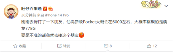 另外,数码博主“旺仔百事通”今日透露,消息称新版P50 Pocket售价大概会在6000元左右,并且很有可能搭载的是骁龙778G。