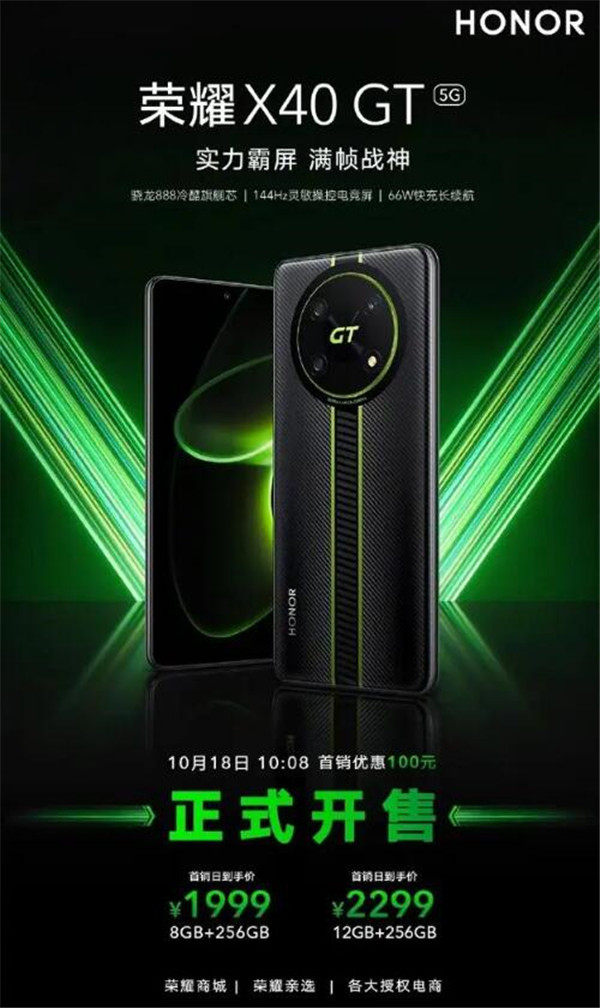 10 月 18 日消息,此前荣耀 X40 GT 5G 手机已发布,于 10 月 18 日(今天)上午 10:08 开售。其中 8GB + 256GB 售价 2099 元,首发价 1999 元;12GB + 256GB 售价 2399 元,首发价 2299 元。荣耀官方称该机采用骁龙 888 冷酷旗舰芯,144Hz 高刷电竞屏,66W 快充长续航。