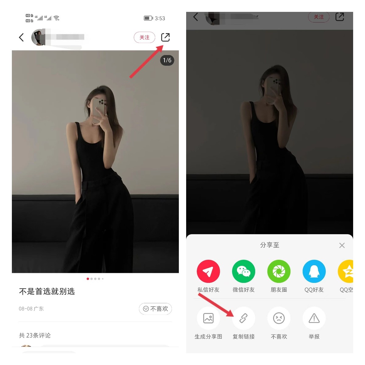 1、在小红书上遇到想要保存去水印的图片视频素材时,点击笔记右上角转发图标,向右滑到“复制链接”,点击复制。