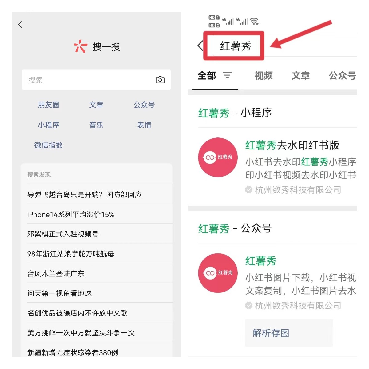 2、然后在微信搜索栏里面搜“红薯秀”,找到红薯秀去水印红书版小程序,然后进入小程序。