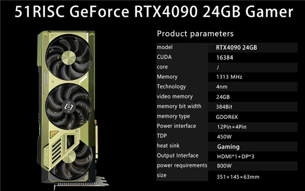 51RISC 新显卡的 PCB 设计与公版一致,使用了定制的散热模块。与大多数 RTX 4090 产品普遍 3.5 槽甚至 4 槽有所不同,51RISC的这款显卡将弧度减小到了三插槽。