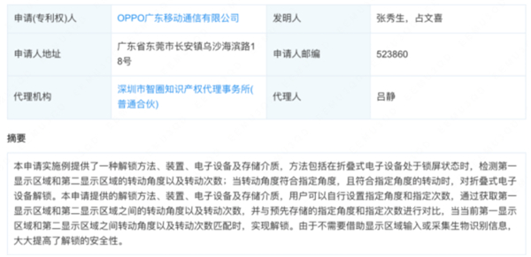 而这一专利的出现,也正式宣布将有全新的手机解锁方式。简单来说,就是在使用OPPO折叠屏手机时,在手机屏幕开合角度达到一定指定位置时且手机开合次数达到指定要求后,手机能够自动解锁。这样的解锁方式,将大幅提高手机解锁的安全性。