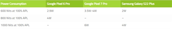 深入研究该机显示屏的功耗后发现,Pixel 7 Pro 在 600 尼特亮度时功耗约 3.5-4W,略低于最大亮度的一半。当触发高亮度模式时,即 1000 尼特左右,功耗就会来到 6W。他们跟不同公关渠道获得评测机的媒体确认过,都有类似的问题。