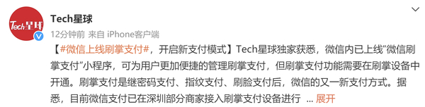 据Tech星球报道,微信内已上线“微信刷掌支付”小程序,可为用户更加便捷的管理刷掌支付。不过需要注意的是,刷掌支付功能需要在刷掌设备中开通。