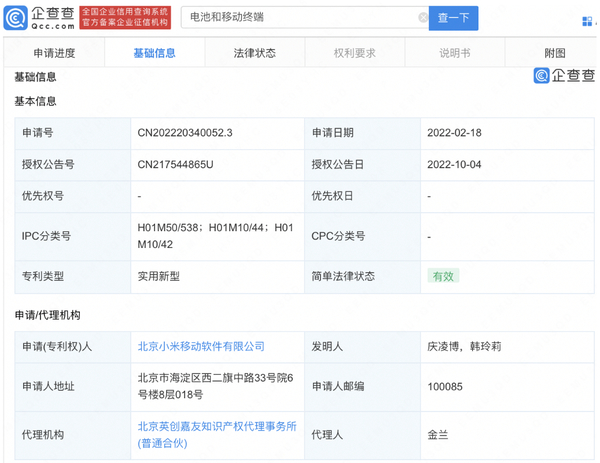 企查查APP显示,近日,北京小米移动软件有限公司申请的“电池和移动终端”专利获授权。该专利的申请日期为2022年2月18日,属于实用新型专利。