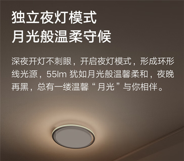 其中,卧室版支持独立夜灯模式,55lm即使深夜开灯也不刺眼。吸顶灯采用LED颗粒,显色指数达Ra95(4000K色点下),并且通过专业机构生物安全检测,蓝光评估为RG0豁免级,无可视频闪。