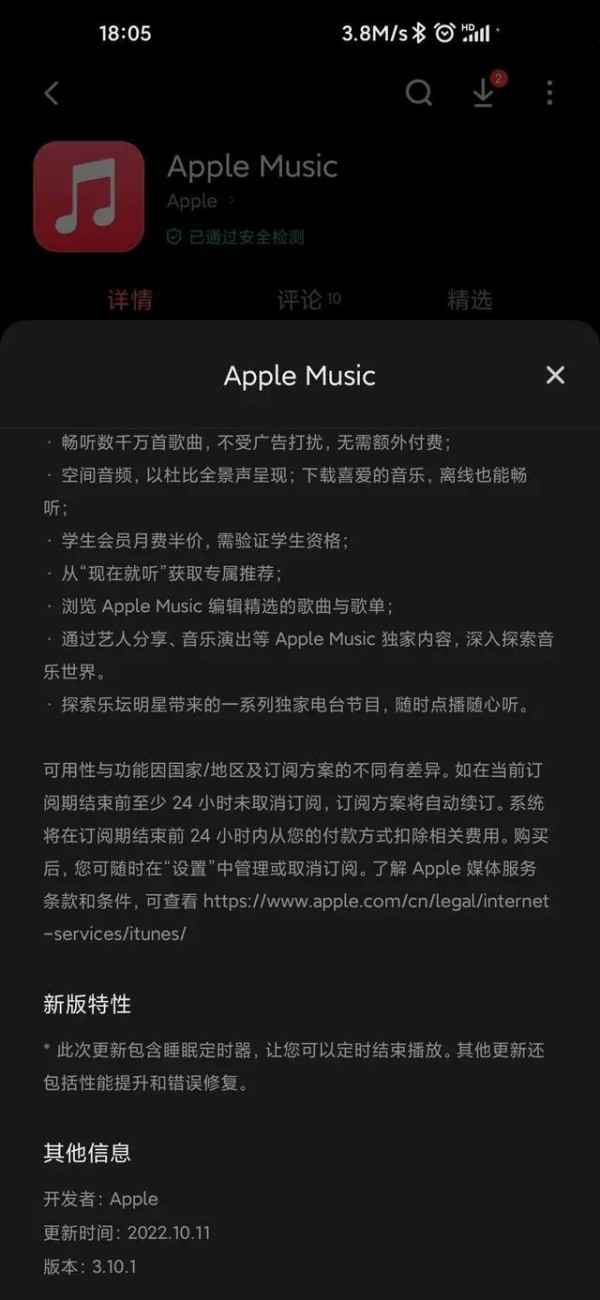 10 月 12 日消息,据网友反馈,近期苹果 Apple Music 安卓版迎来了版本跃升,从 3.7.2 升级到 3.10.1.