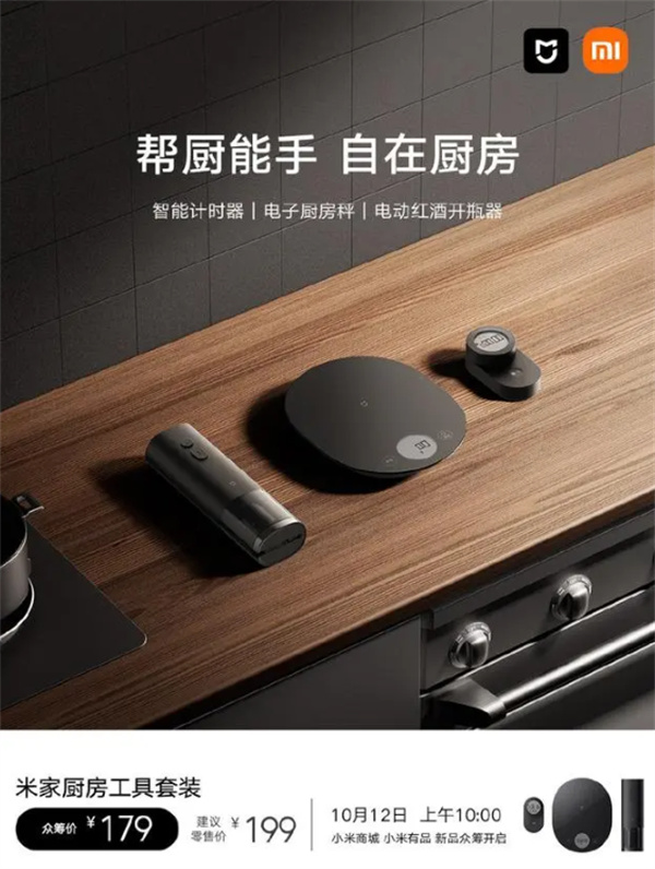 10 月 12 日消息,今日上午 10:00.小米米家厨房工具套装正式开启众筹,包括智能计时器、电子厨房秤、电动红酒开瓶器三款工具,零售价 199 元,众筹价 179 元。