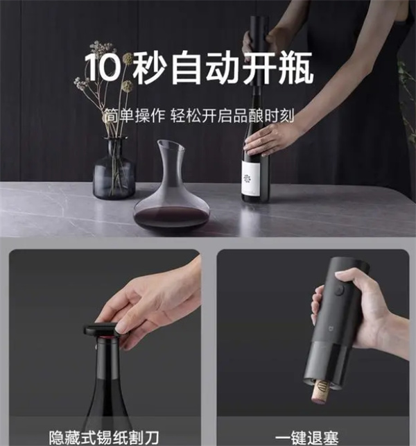 此外,米家电动红酒开瓶器可 10 秒自动开瓶,配备开瓶 / 退塞两个按键,满电可开瓶 170 次,需要 4 节 5 号电池。