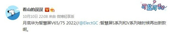 10月10日,据数码博主@看山的叔叔 爆料,10月底,华为智慧屏V65/75 2022将有望亮相并发布。至于华为智慧屏S系列,目前还没有更多消息。