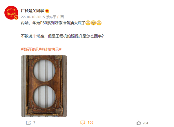 上个月,华为发布了Mate 50系列,凭借XMAGE影像、华为昆仑玻璃等特点受到不少消费者的追捧,部分型号出现一机难求的情况。有消息称除了Mate系列,华为P60系列将于明年3-4月亮相,据数码博主“厂长是关同学”透露,华为P60系列似乎准备换大底了,并且P60系列工程机的拍照有比较明显的提升。