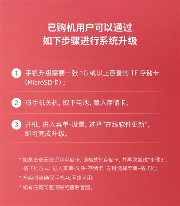 需要注意的是,手机升级需要一张 1GB 或以上容量的 TF 存储卡(MicroSD 卡)。用户可进入菜单-设置,选择“在线软件更新”完成升级。