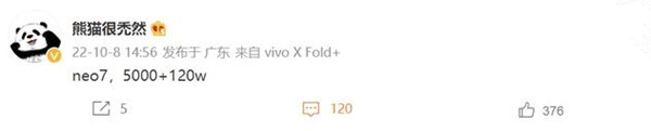 10 月 9 日消息,时间来到 10 月,有关 iQOO Neo7 的爆料愈来愈多。据数码博主 @熊猫很禿然 爆料,iQOO Neo7 将配备 5000mAh 电池,支持 120W 闪充。