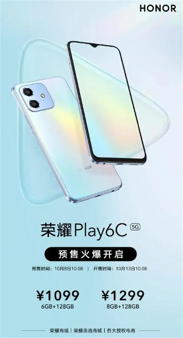 10 月 8 日消息,荣耀今天发布了一款入门机型荣耀 Play6C,目前新机已经开启预售,将于 10 月 13 日正式开售,售价 1099 元起。