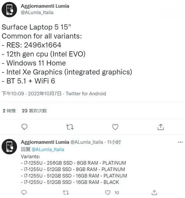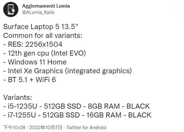 据爆料者 @Aggiornamenti Lumia 提供的信息显示,Surface Laptop 5 包含 13.5 英寸和 15 英寸两个版本,今搭载英特尔处理器。