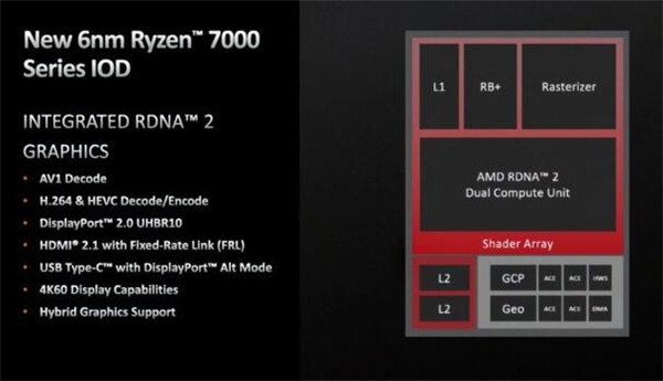 今日,AMD 官方展示了该核显的功能,在视频解码和显示输出方面比较强。该核显支持 H.264 和 H.265 的解码和编码,还支持 AV1 的解码,但不支持 AV1 编码。