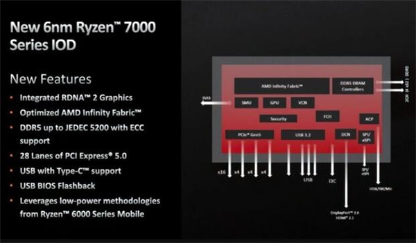 IOD 功能显示,锐龙 7000 系列的 I / O 芯片支持更快的 DDR5-5200 JEDEC 内存规格(英特尔 Alder Lake 默认为 4800 MT / s)。IOD 还支持多达 28 个 PCIe Gen5 通道,供下一代 GPU 和存储解决方案使用。
