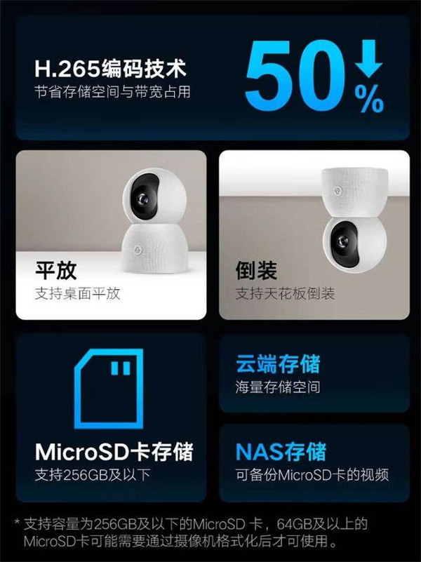 小米智能摄像机 2 AI 增强版支持 2.4GHz 和 5GHz 双频 WiFi 连接,支持 256GB 及以下 micro SD 卡进行存储。同时,小米智能摄像机 2 AI 增强版支持 H.265 编码技术,官方声称可节省 50% 存储与带宽占用。