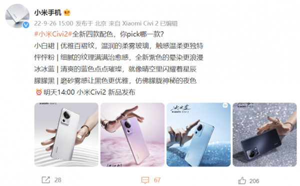 据悉,全新的小米Civi 2将于9月27日14:00正式亮相,并且将在工业设计上迎来新突破。更多详细信息,我们拭目以待。