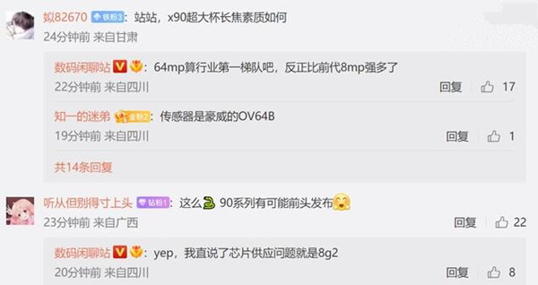 该博主在评论区表示,vivo X90 系列新机有可能在 iQOO 11 系列新机之前发布,并且芯片供应问题主要就是高通骁龙 8 Gen 2 芯片的供应。同时,该博主称 vivo X90 系列新机超大杯(预计为 vivo X90 Pro+)将采用 6400 万像素长焦镜头,“算是行业第一梯度,比前代的 8MP 强多了”。