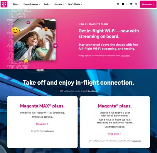 订购了高端 Magenta Max 套餐的 T-Mobile 客户,可享不限流量的机上 Wi-Fi 与流媒体服务。