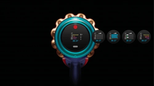 在全新设计的在Fluffy Optic™光学软绒滚筒吸头中,工程师们将光源安装在吸头末端尽可能低的位置,形成一道20°的光束、照射出地面上的微尘; PCB印刷电路板经过精准设计,能保持光源冷却,无需额外的散热器。与此同时,在利用压电式声学传感技术实现实时灰尘分类统计的基础之上,用户交互数显界面也经过全新设计,可以实时动态反馈灰尘数据和地面清洁程度:启动机器时,LCD液晶屏会显示4种尺寸的颗粒物,这些条形图会根据捕获颗粒物的浓度变化,实时伸长或缩短,并为用户的清洁提供指导。