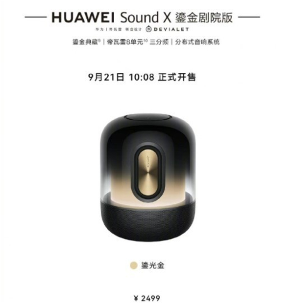 本月初,华为举行了新品发布会,有不少新品上市。比较关注数码产品的消费者应该知道,其中就有华为Sound X鎏金剧院版。这款智能音箱在华为Sound X的基础上,在音质、交互、颜值等方面带来了新的体验。华为Sound X鎏金剧院版于今天上午10点08分正式开售,价格为2499元。