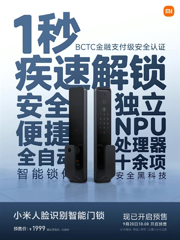 9月20日,小米人脸识别智能门锁发布,全渠道现已开启预售,预售到手价1999元!
