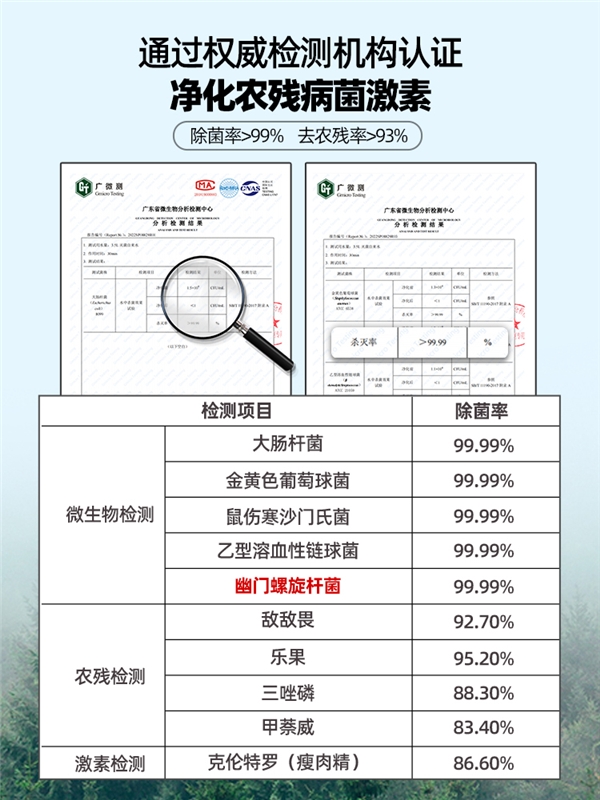 除了常见的大肠杆菌、幽门螺旋杆菌等微生物,Kayjess果蔬净化机对敌敌畏、乐果等农残的净化效果也远高于行业标准,同时在瘦肉精这些激素残留物的净化效果上也有显著作用,这是前几代果蔬净化技术所不能达到的。