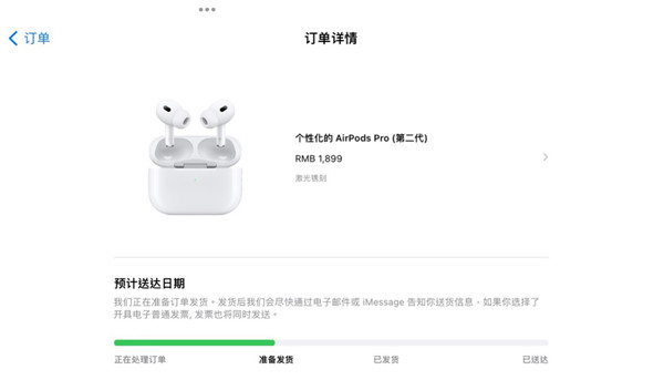 AirPods Pro 2 现已进入发货状态,苹果处理页面显示,“我们正在准备订单发货。发货后我们会尽快通过电子邮件或 iMessage 告知你送货信息。”