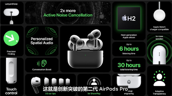 官方称 AirPods Pro 2 内置芯片升级为了新一代 H2 芯片,解锁了突破性的音频表现,对主动降噪和通透模式进行了重大升级,新款的主动降噪能力最高提升到2倍,同时通过独特方式为用户带来更加身临其境的空间音频体验。耳柄支持按压和滑动操控,向上向下滑动可以调节音量。