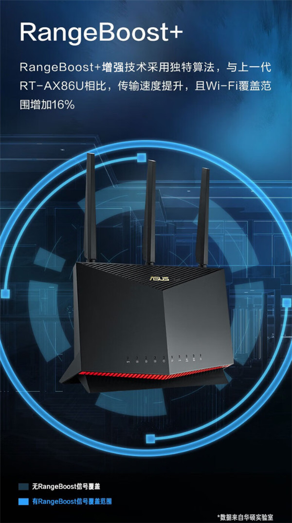 华硕 RT-AX86U Pro 电竞路由器支持 RangeBoost + 增强技术,采用独特算法,官方声称相比上一代 RT-AX86U 不仅传输速度有所提升,还增加了 16% 的 Wi-Fi 覆盖范围。同时,华硕 RT-AX86U Pro 电竞路由器支持手游电竞模式,可通过手机 App 一键开启电竞加速,并且不限手机厂牌。