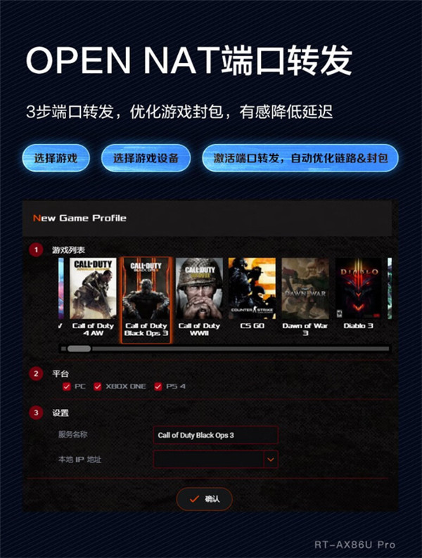 华硕 RT-AX86U Pro 电竞路由器支持 OPEN NAT 端口转发,可优化游戏封包,有感降低延迟。同时,华硕 RT-AX86U Pro 电竞路由器搭载 AiProtecton Pro 安全防护系统,保护网络安全。此外,该路由器还支持家长管理功能,可查看家庭成员的互联网活动。
