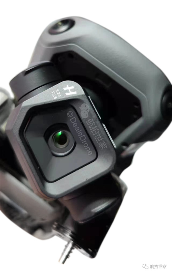 还有一张正面图可以看到,该无人机搭载与 Mavic 3 相同的主摄,等效焦距 24,最大光圈 f / 2.8。航拍世家表示,目前消息为依然会采用尺寸 4/3" 的 CMOS。