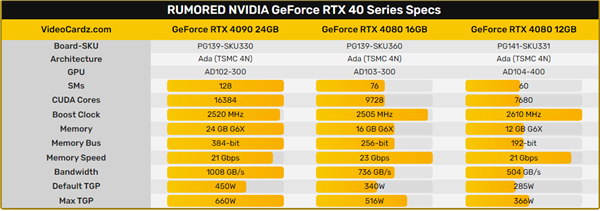 RTX 4090预计基于AD102 GPU核心打造,加速频率最高2520MHz,内建16384个CUDA,匹配24GB GDDR6X显存(384-bit,21Gbps),整卡功耗450~660W。