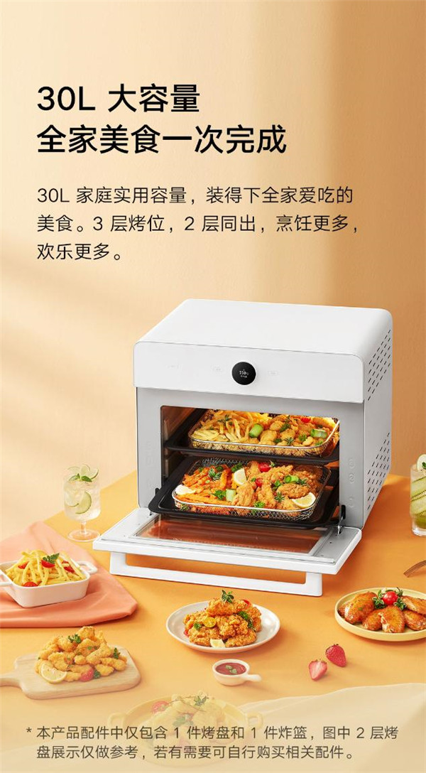该空气炸烤箱内部拥有 30L 容量,共有 3 层烤位,可 2 层同出,官方声称“全家美食一次完成”。在米家智能空气炸烤箱 30L 上下共拥有 2 颗 NTC 感温探头,可实时感知腔体内部温度变化,烘焙更易成功。